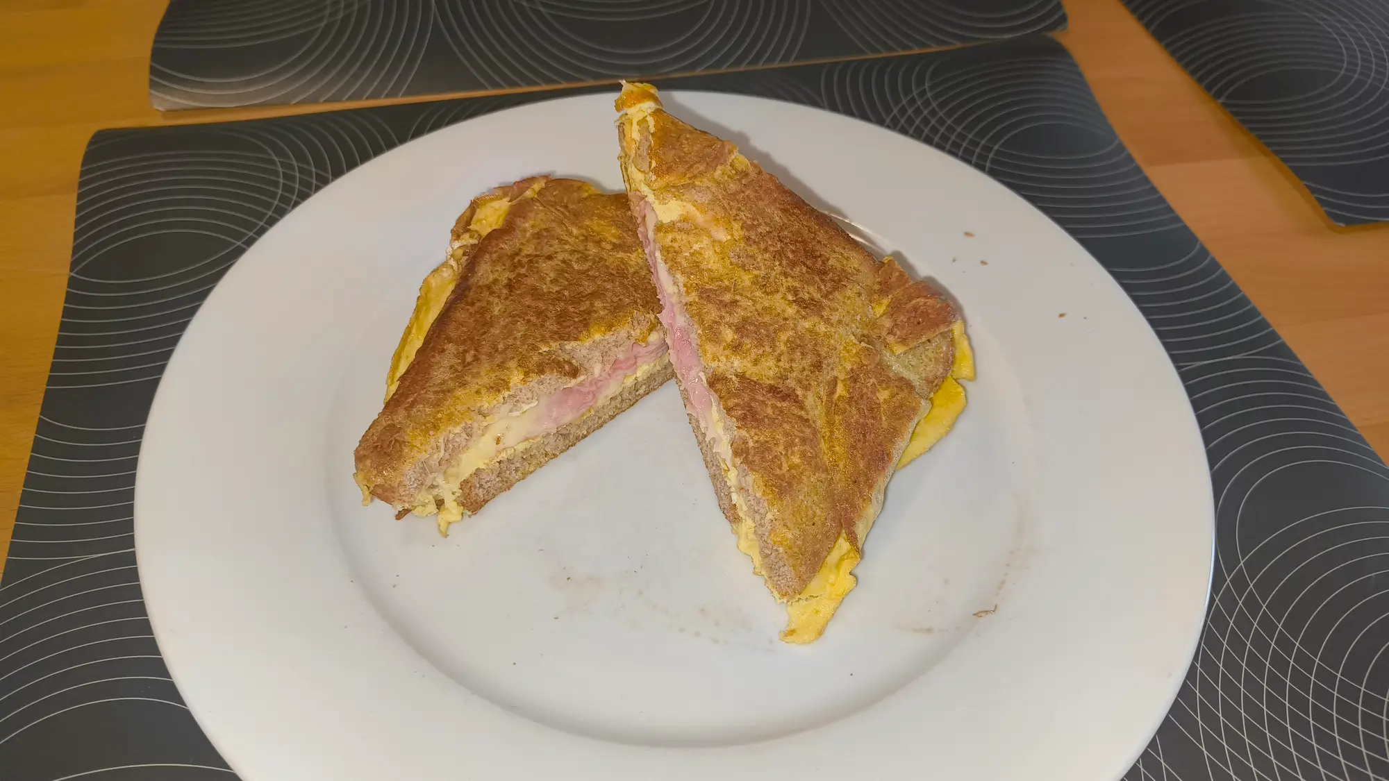 Beide Toastscheiben kurz auf leicht stockendes Ei geben, danach umdrehen (es soll bisschen Ei auf beiden Seiten sein - evtl ist das auch unnötig?)